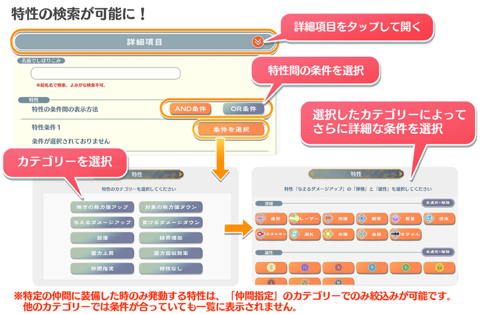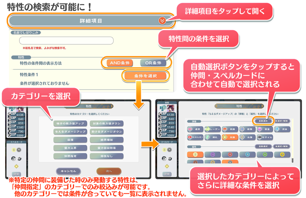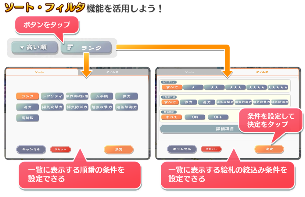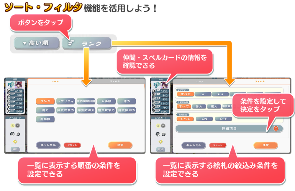 UIの改修を行い、現在の絵札のフィルタに「名前」「上昇能力値」「特性」「ランク」「限界突破」が追加されました。
