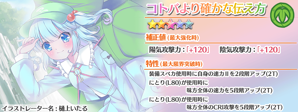 「コトバより確かな伝え方」は、「世界一位 河城にとり(L80)」が装備すると強力な追加効果のある絵札です!