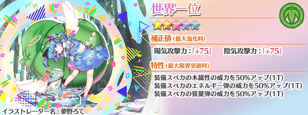 ※「世界一位 河城にとり(L80)」以外の限定キャラクターは登場しません。
