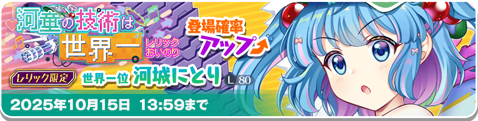 ※「世界一位 河城にとり(L80)」は「河童の技術は世界一」レリックおいのり終了後、通常開催しているおいのりには追加されません。
