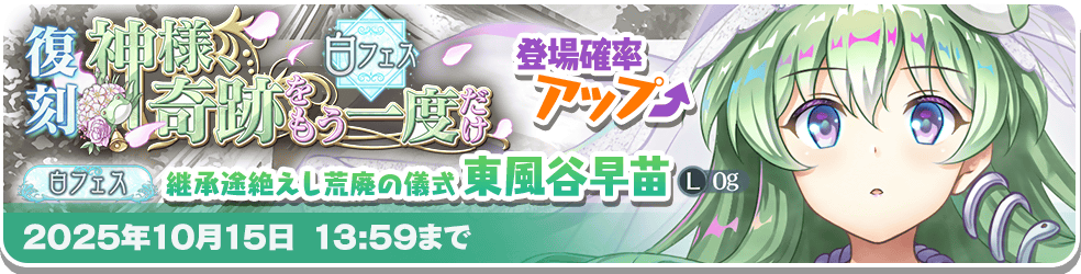 ※「継承途絶えし荒廃の儀式 東風谷早苗(L0g)」は「神様、奇跡をもう一度だけ」復刻白フェスおいのり終了後、通常開催しているおいのりには追加されません。
