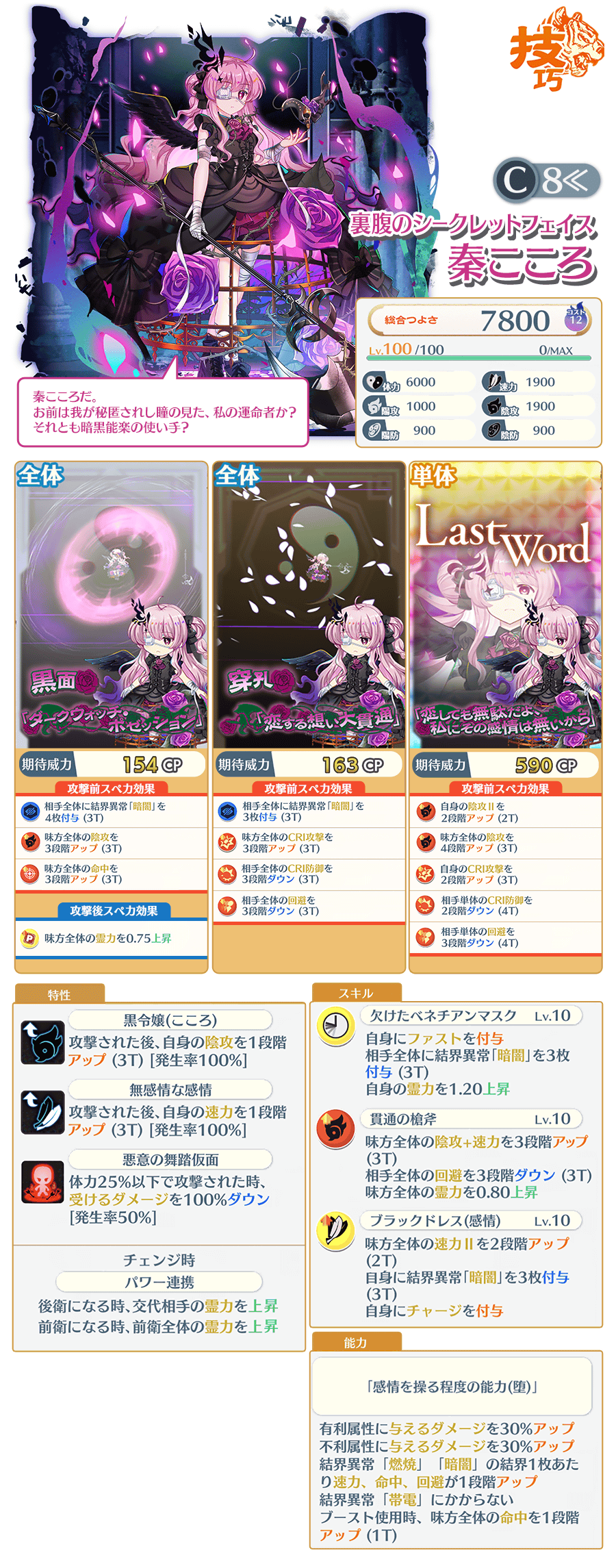 「裏腹のシークレットフェイス 秦こころ(C8≪)」は、エピックおいのり限定で登場するキャラクターです。