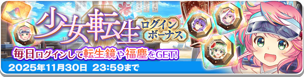 「古明地さとり(C3)」 「古明地こいし(C3)」 「奥野田美宵(C3)」 「八坂神奈子(L80)」 の少女転生実装を記念して、各キャラクターの「転生鏡」をログインボーナスでプレゼント!