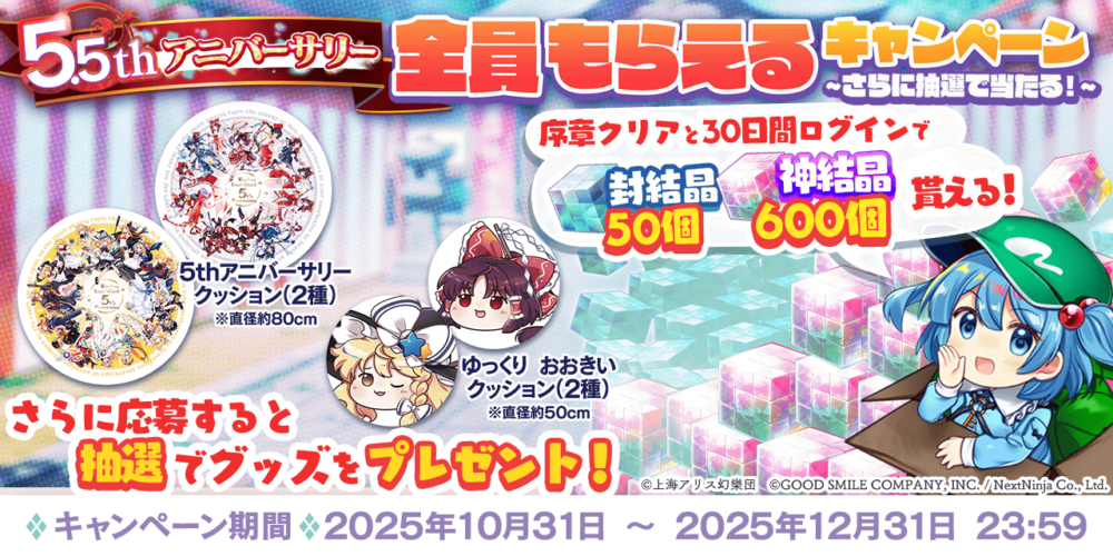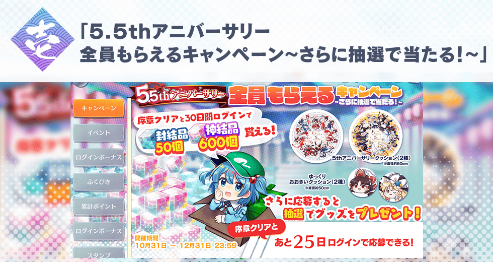 本規約は、東方LostWordが日本国内向けに実施するキャンペーン「5thアニバーサリー全員もらえるキャンペーン~さらに抽選で当たる!~」(以下、キャンペーンといいます)に適用されます。