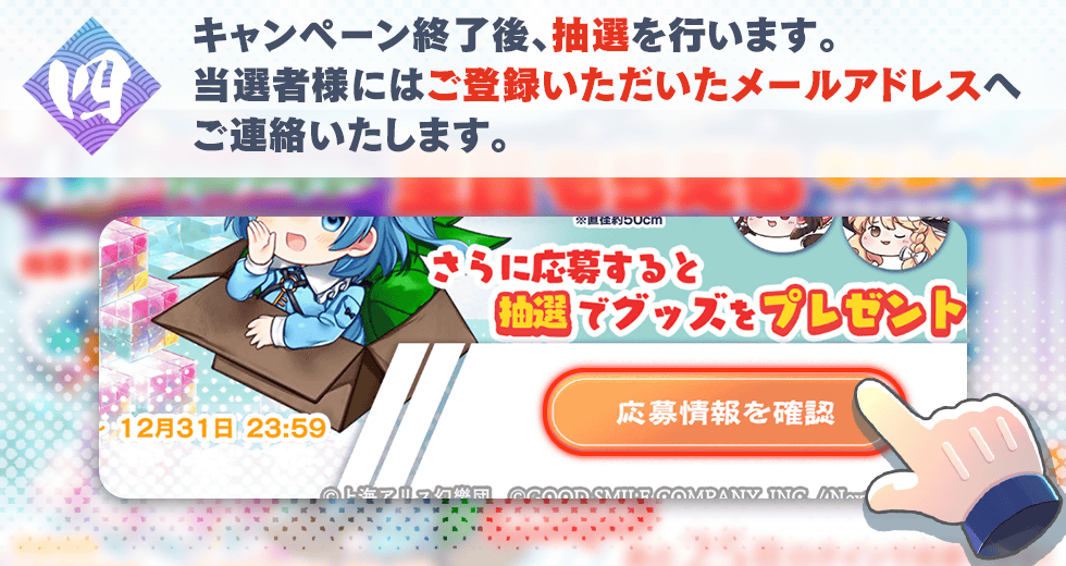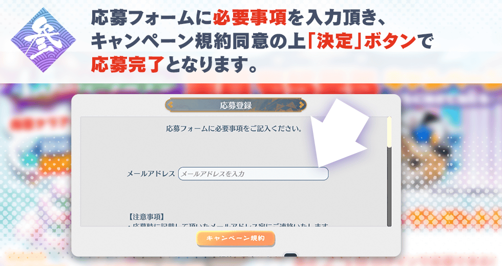 ※「神結賞」「封結賞」に関しては、条件を達成した時点で未応募の状態でもプレゼントの対象となります。グッズへの抽選に参加する場合は、メールアドレスを入力する応募が必要となります。