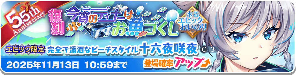 ※「今宵のディナーはお魚づくし」エピックおいのりでは、交換P50で、☆5絵札「海面の能面あやかし」を交換できます。