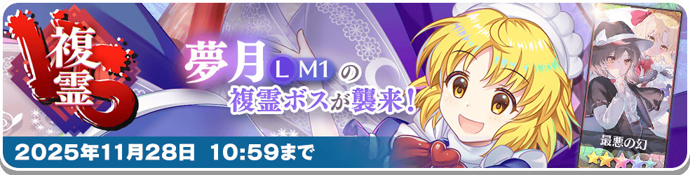 ・「高難度チャレンジ さとり」において、エネミーの「洩矢諏訪子(L0g)」の大結界「破界効果」が本来のものと異なっている不具合を修正しました。
