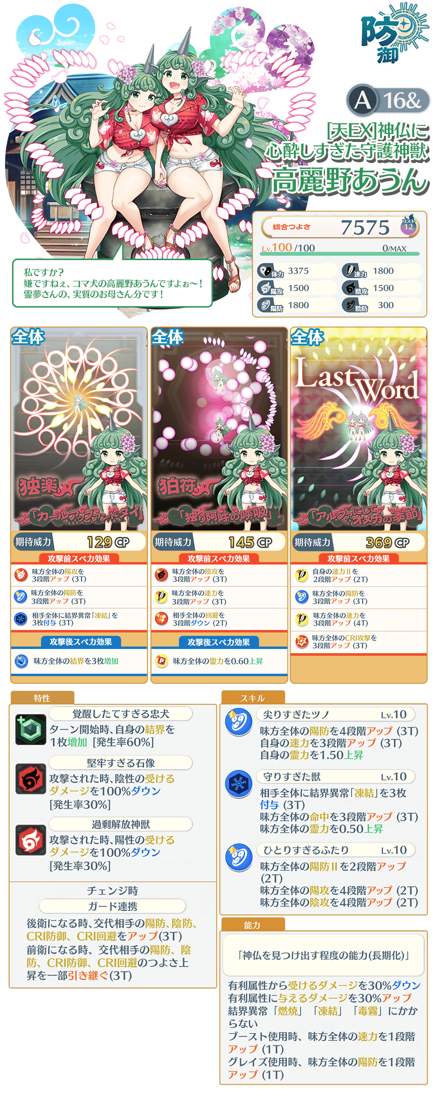 「[天EX]神仏に心酔しすぎた守護神獣 高麗野あうん(A16&)」は、EXフェス限定で登場するキャラクターです。