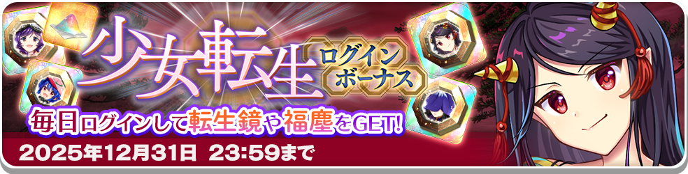 少女転生実装予定の「聖白蓮(T5)」 「比那名居天子(T5)」 「豫母都日狭美(L1)」 「日白残無(L1)」の「転生鏡」をログインボーナスでプレゼント!