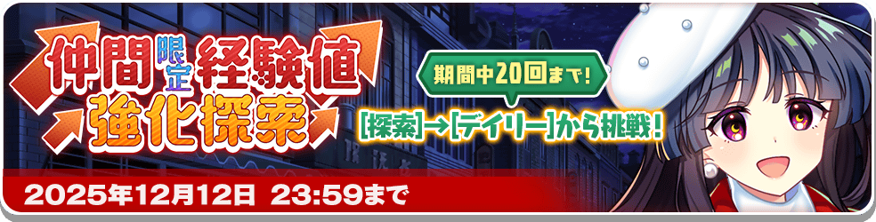 期間限定で、デイリー探索に「仲間限定経験値強化探索」が登場します。