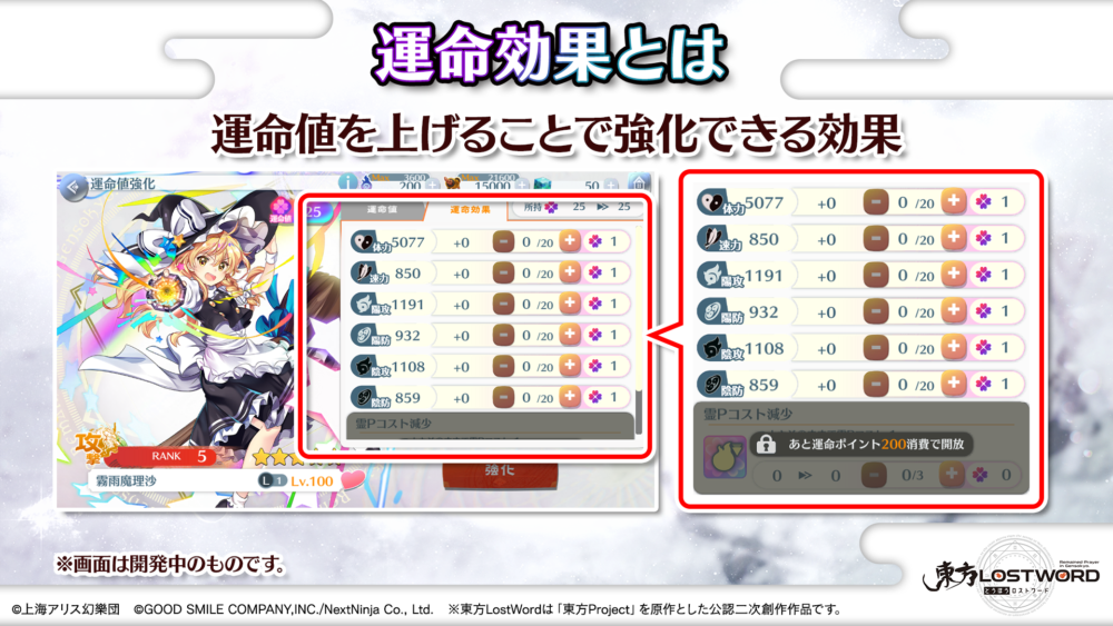 最大まで限界突破をした仲間は、運命値と同じ数だけ「運命強化ポイント」を獲得できます。このポイントを使用し、体力、速力、陽攻、陽防といった各種ステータスを少しだけ上げられるようになります。