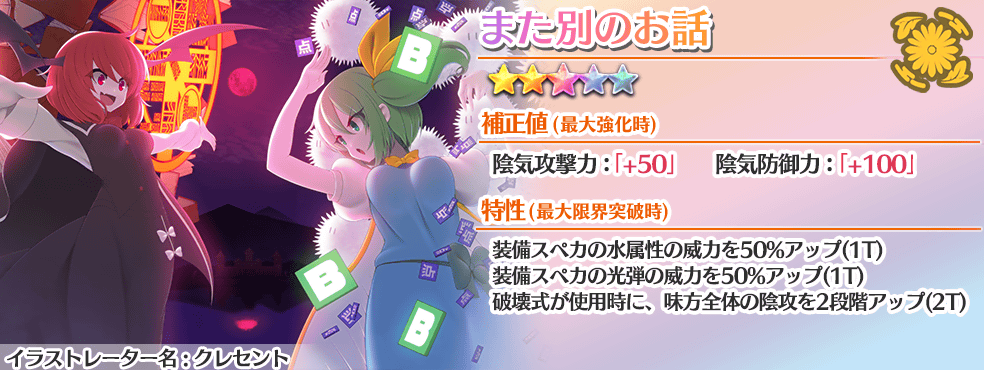 ・「[記憶断片5]幽玄の剣聖 魂魄妖夢(R8.-5)」を初獲得した際に、バトルキャラの一部が正しく表示されない不具合を修正しました。