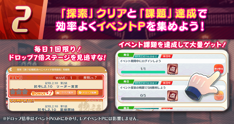 ※ドロップ7倍は通常のイベントPのみにかかり、レアイベントPには影響しません。