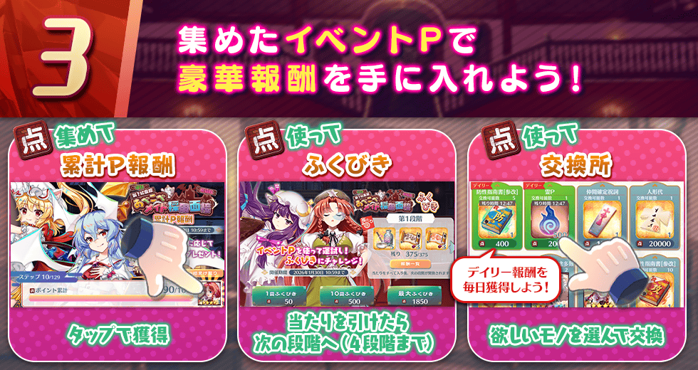 ※レアイベントPに累計報酬、ふくびきはありません。本イベント専用の交換所でのみ使用が可能です。