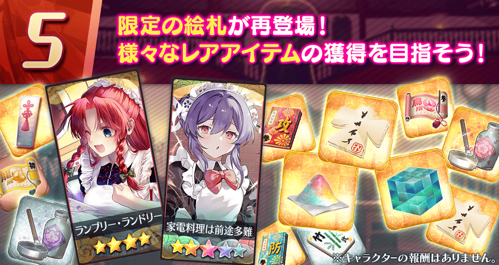 ※仲間確定祝詞で登場するキャラクター、絵札祝詞で登場する絵札はゲーム内のお知らせをご覧ください。