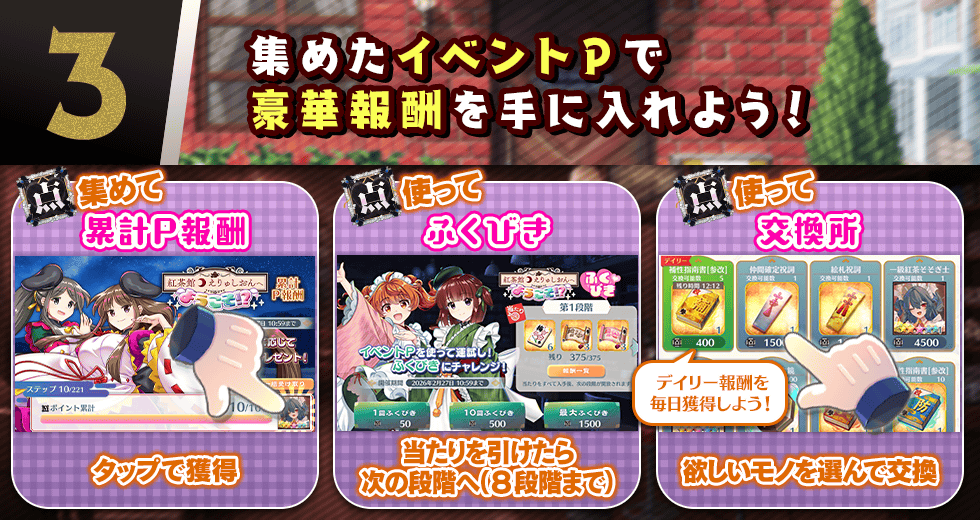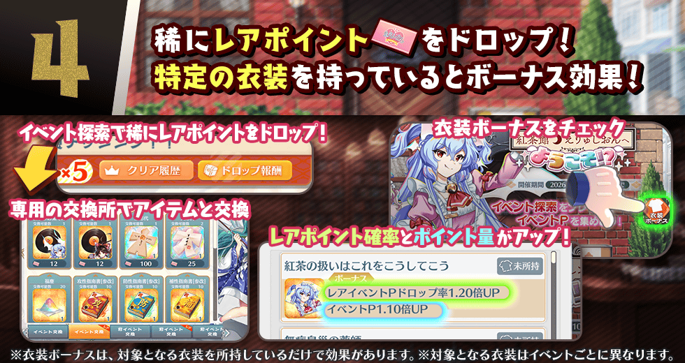 ※本イベントで獲得できるレアイベントPは、本イベント専用のものとなります。別のイベントのレアイベントPとして、交換所での使用はできませんのでご注意ください。