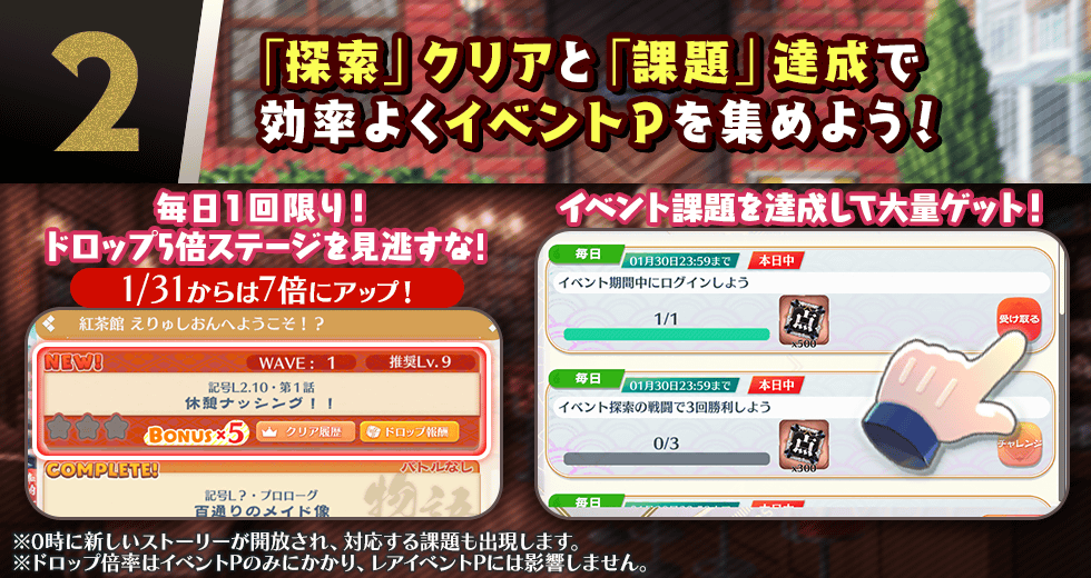 一部探索は、1日1回、獲得できるイベントPが5倍になります。