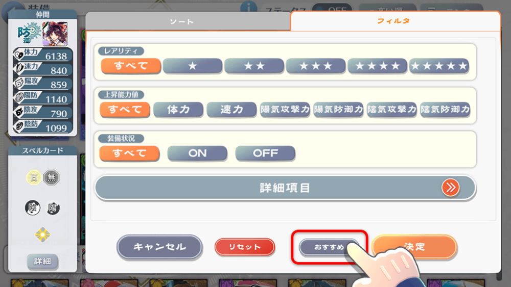 仲間詳細画面の装備から遷移する絵札一覧にて、フィルタ設定に「おすすめ」ボタンが追加されます。