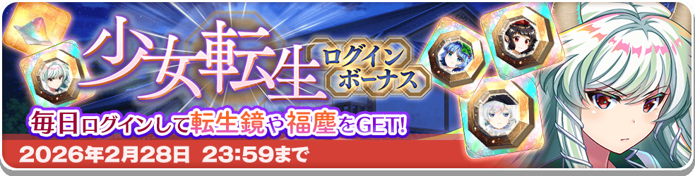 少女転生実装予定の「レティ・ホワイトロック(H5)」「射命丸文(A9)」「河城にとり(A10)」「上白沢慧音(L1A)」の「転生鏡」をログインボーナスでプレゼント!