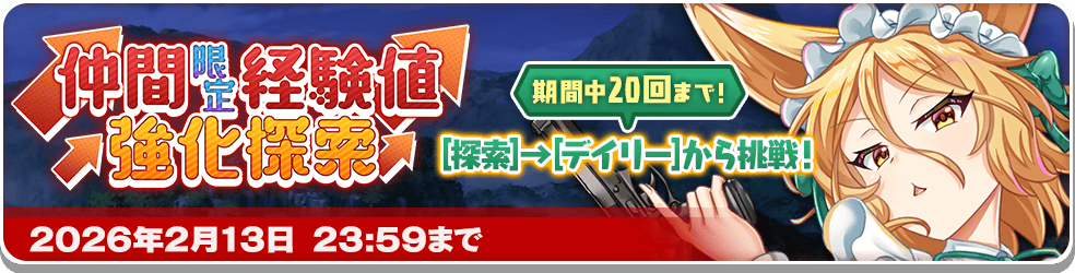 期間中に20回まで挑戦可能で、「仲間経験値強化探索」と同様に大量の経験値を獲得することができます!