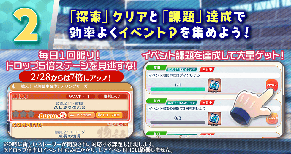 一部探索は、1日1回、獲得できるイベントPが5倍になります。