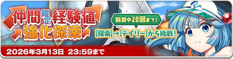 期間中に20回まで挑戦可能で、「仲間経験値強化探索」と同様に大量の経験値を獲得することができます!
