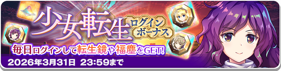 少女転生実装予定の「聖白蓮(A12)」「豊聡耳神子(A13)」「アリス・マーガトロイド(A7)」の「転生鏡」をログインボーナスでプレゼント!