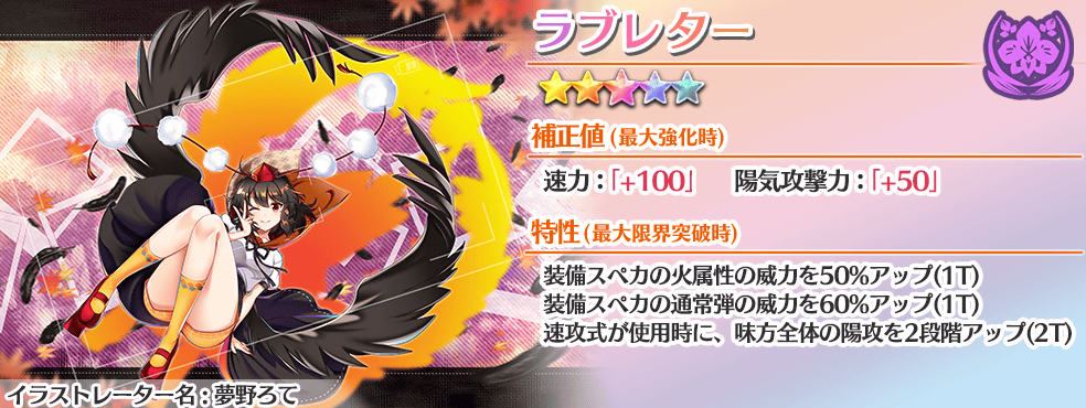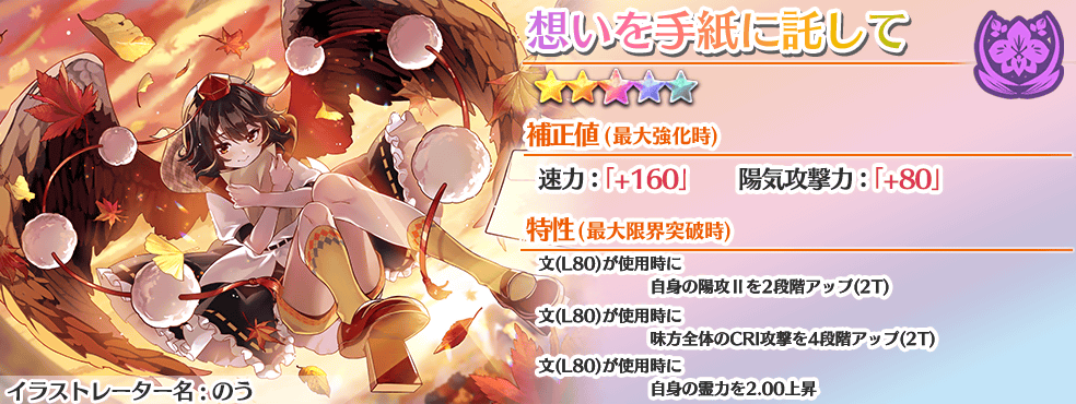 「ラブレター 射命丸文(L80)」は、レリックおいのり限定で登場するキャラクターです。