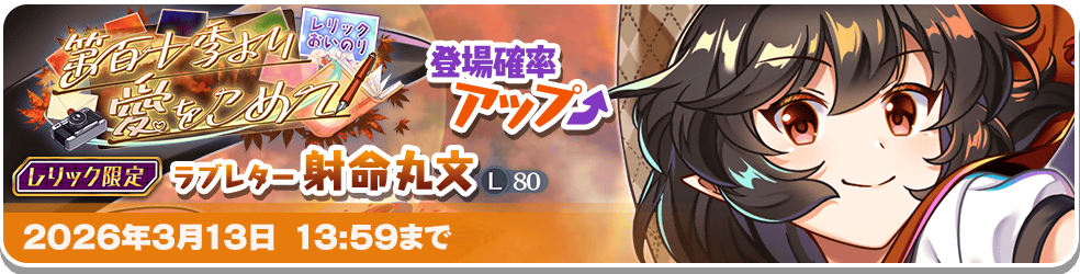 「ラブレター 射命丸文(L80)」の登場確率がアップしたおいのりが登場します!