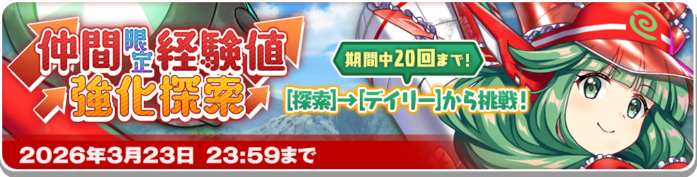 期間中に20回まで挑戦可能で、「仲間経験値強化探索」と同様に大量の経験値を獲得することができます!