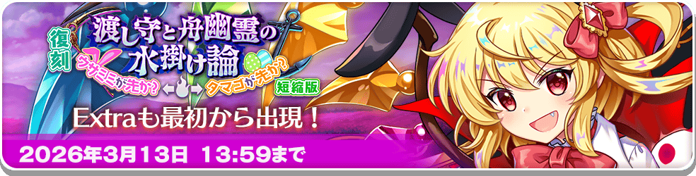 復刻イベント「渡し守と舟幽霊の水掛け論 ウサミミが先か?タマゴが先か? 短縮版」は、すべてのストーリー・難易度・Extraが開放された状態で開催されます。 そのため、イベント開催初日からHARD、LUNATIC、Extraをプレイすることができます。