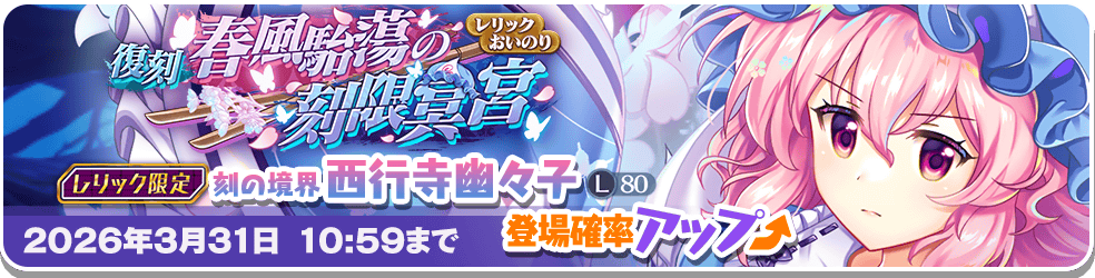 「刻の境界 西行寺幽々子(L80)」の登場確率がアップしたおいのりが再登場します!