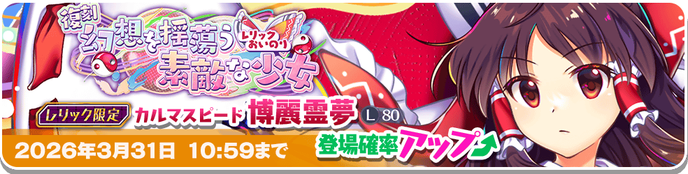 「カルマスピード 博麗霊夢(L80)」は、レリックおいのり限定で登場するキャラクターです。