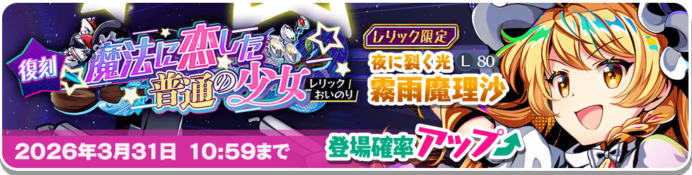 「夜に裂く光 霧雨魔理沙(L80)」の登場確率がアップしたおいのりが再登場します!