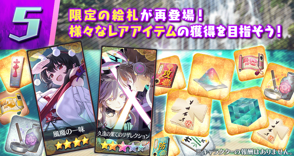※仲間確定祝詞で登場するキャラクター、絵札祝詞で登場する絵札はゲーム内のお知らせをご覧ください。