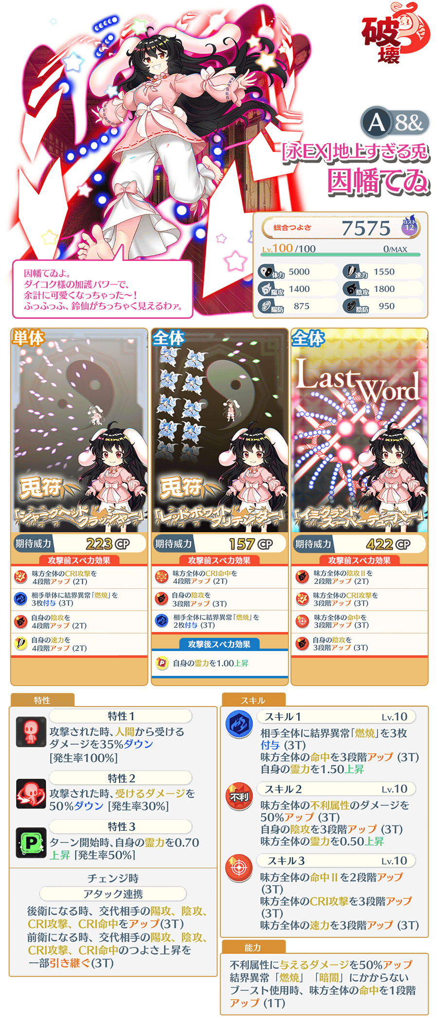 ※「[永EX]地上すぎる兎 因幡てゐ(A8&)」は同名の仲間、もしくは「大形代」で限界突破できます。汎異記号と二つ名が異なる仲間、対応していない形代では限界突破できません。
