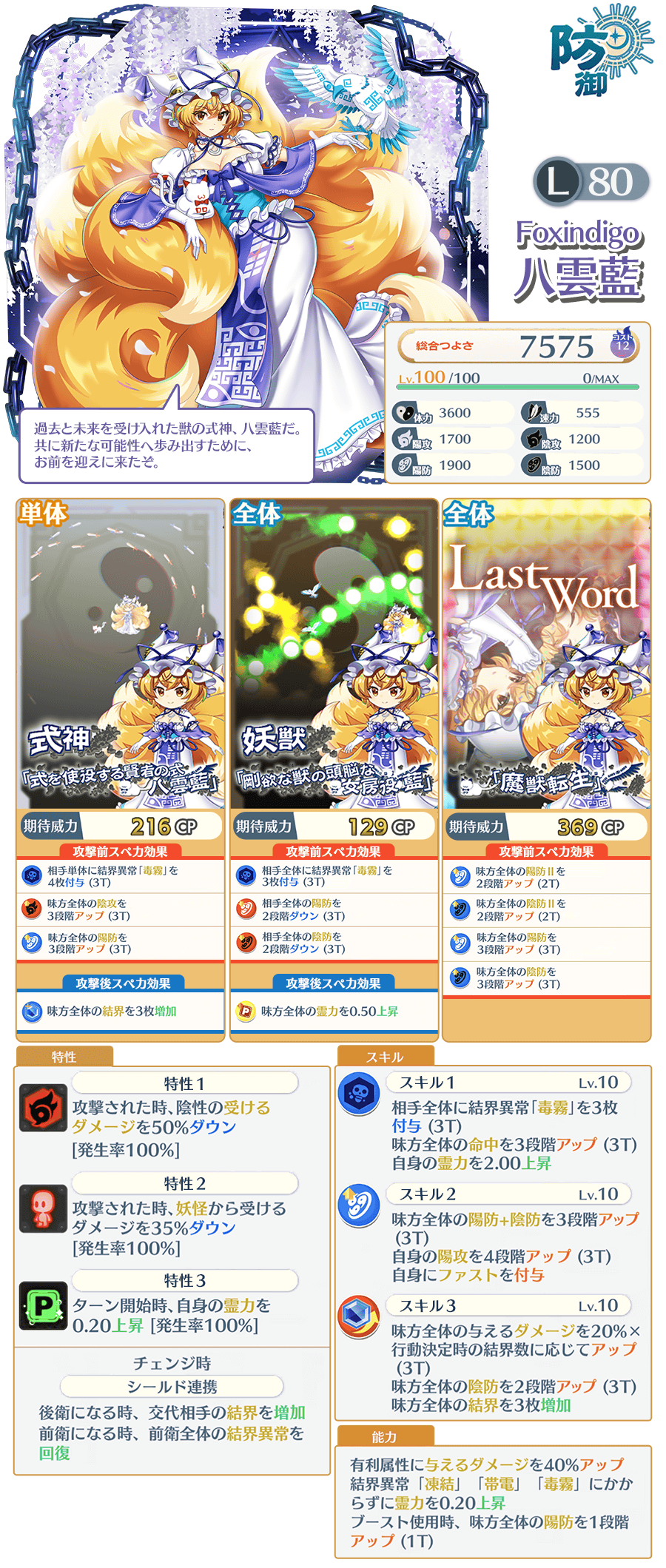 「Foxindigo 八雲藍(L80)」は、レリックおいのり限定で登場するキャラクターです。