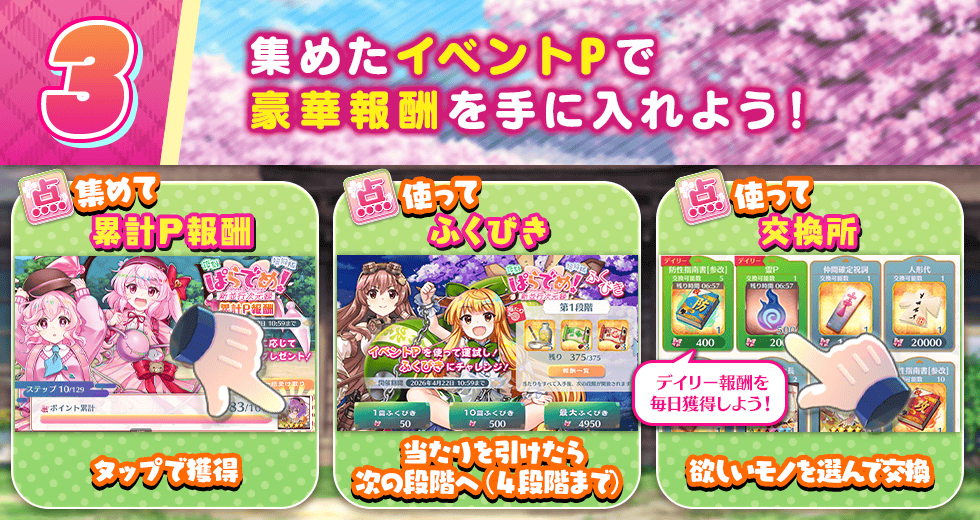 ※レアイベントPに累計報酬、ふくびきはありません。本イベント専用の交換所でのみ使用が可能です。