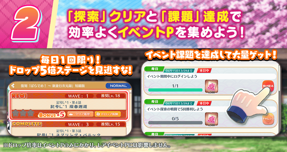 ※ドロップ5倍は通常のイベントPのみにかかり、レアイベントPには影響しません。