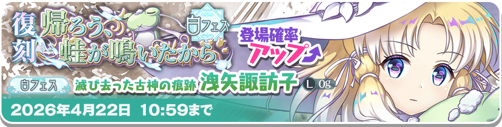 「滅び去った古神の痕跡 洩矢諏訪子(L0g)」 の登場確率がアップしたおいのりが登場!