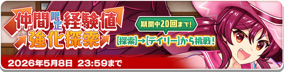 期間中に20回まで挑戦可能で、「仲間経験値強化探索」と同様に大量の経験値を獲得することができます!