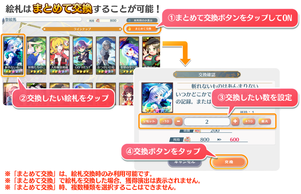 絵札祭絵馬に関して、交換したい数を設定して、まとめて交換することが可能になります。