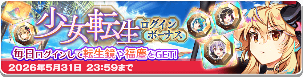 少女転生実装予定の「霧雨魔理沙(Cz1)」 「多々良小傘(C3)」 「鈴仙・優曇華院・イナバ(L80)」 「蓬莱山輝夜(L80)」の「転生鏡」をログインボーナスでプレゼント!
