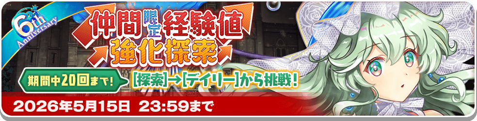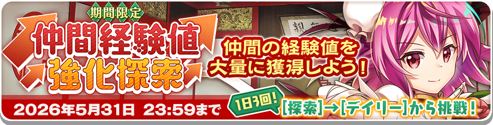 期間中に20回まで挑戦可能で、「仲間経験値強化探索」と同様に大量の経験値を獲得することができます!